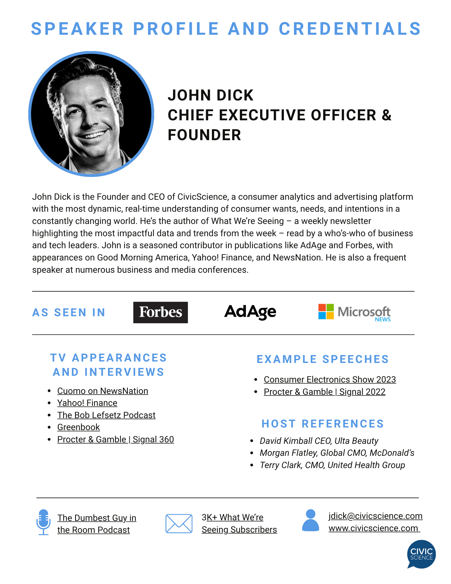 John Dick is the Founder and CEO of CivicScience, a consumer analytics and advertising platform serving the largest brands and media companies in the world. He’s the host of the podcast, The Dumbest Guy in the Room and author of What We’re Seeing, the weekly newsletter read by a who’s-who of business and tech leaders. John is a contributor to AdAge and Forbes and has appeared on Good Morning America, Yahoo! Finance, and NewsNation, and as a speaker at numerous business and media conferences.